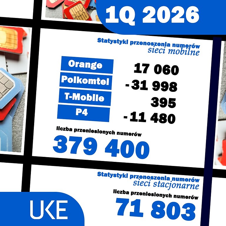 W sieciach stacjonarnych w I kwartale 2026 roku przeniesionych zostało łącznie 71 803 numery, czyli o ponad 9 tys. numerów mniej niż w poprzednim kwartale, kiedy liczba ta wyniosła 81 069.