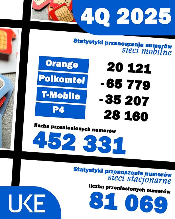 W sieciach stacjonarnych w IV kwartale 2025 roku przeniesionych zostało łącznie 81 069 numerów, czyli o prawie 21 tys. numerów więcej niż w poprzednim kwartale, kiedy liczba ta wyniosła 60 170.