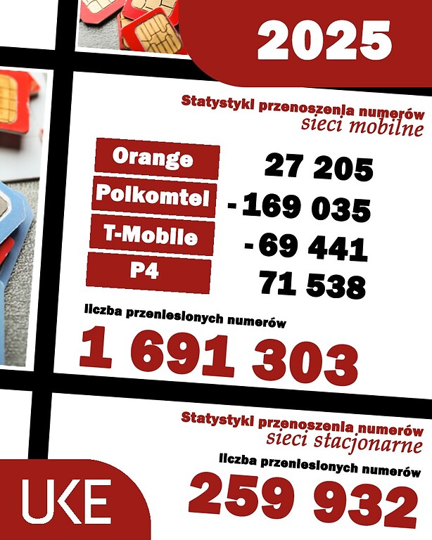 W całym 2025 roku w sieciach mobilnych przeniesiono 1 691 303 numery. W wyniku przenoszenia numerów Orange Polska w całym roku zyskał 27 205 użytkowników kart SIM, Polkomtel (operator sieci Plus) stracił 169 035, T-Mobile zakończył rok tracąc 69 441 użytkowników kart SIM, a P4 (operator sieci Play, dane bez d. UPC Polska) zyskał 71 538 użytkowników kart.